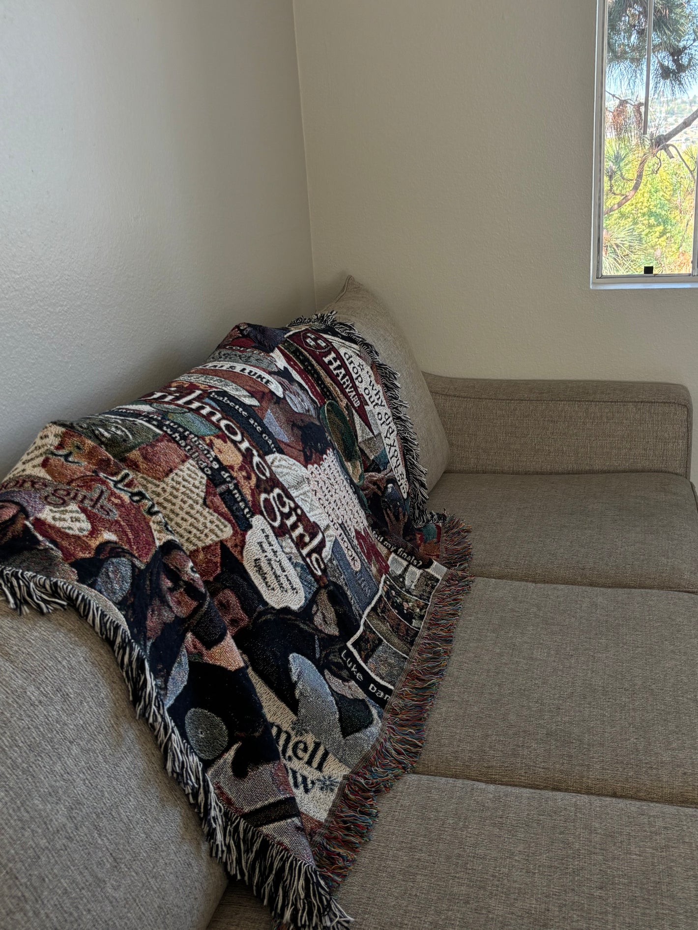 Wrap yourself in the magic of Stars Hollow this fall β crisp leaves, cozy nights, and coffee in hand. Woven from 100% cotton with colorful fringed edges, this tapestry blanket is perfect for hanging as wall art or curling up on the couch for your next Gilmore Girls marathon.